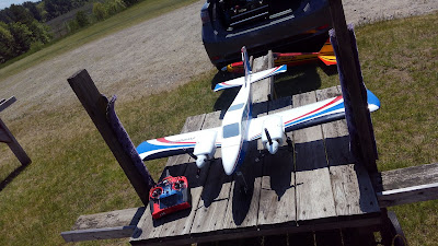 I even had my son Luke with me to video... but alas, nothing flying today. The Pulse was not running right since getting her muffler tightened, and part of it was the fuel lines kinking. I knew this might be a problem at some point and it was today. And to boot, the screw that secures the spinner stripped. Grounded.